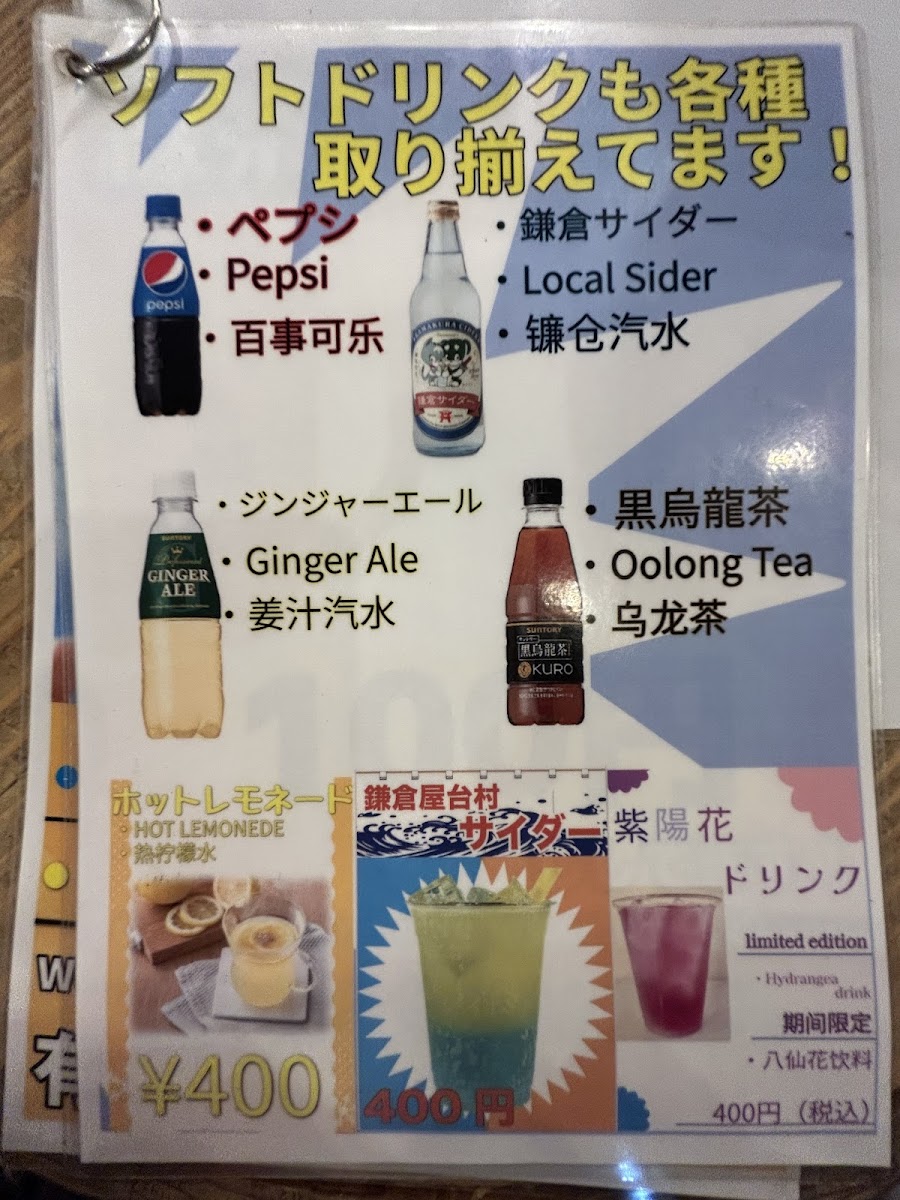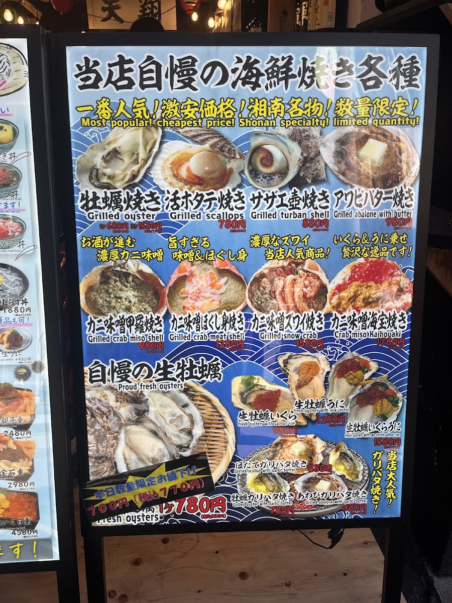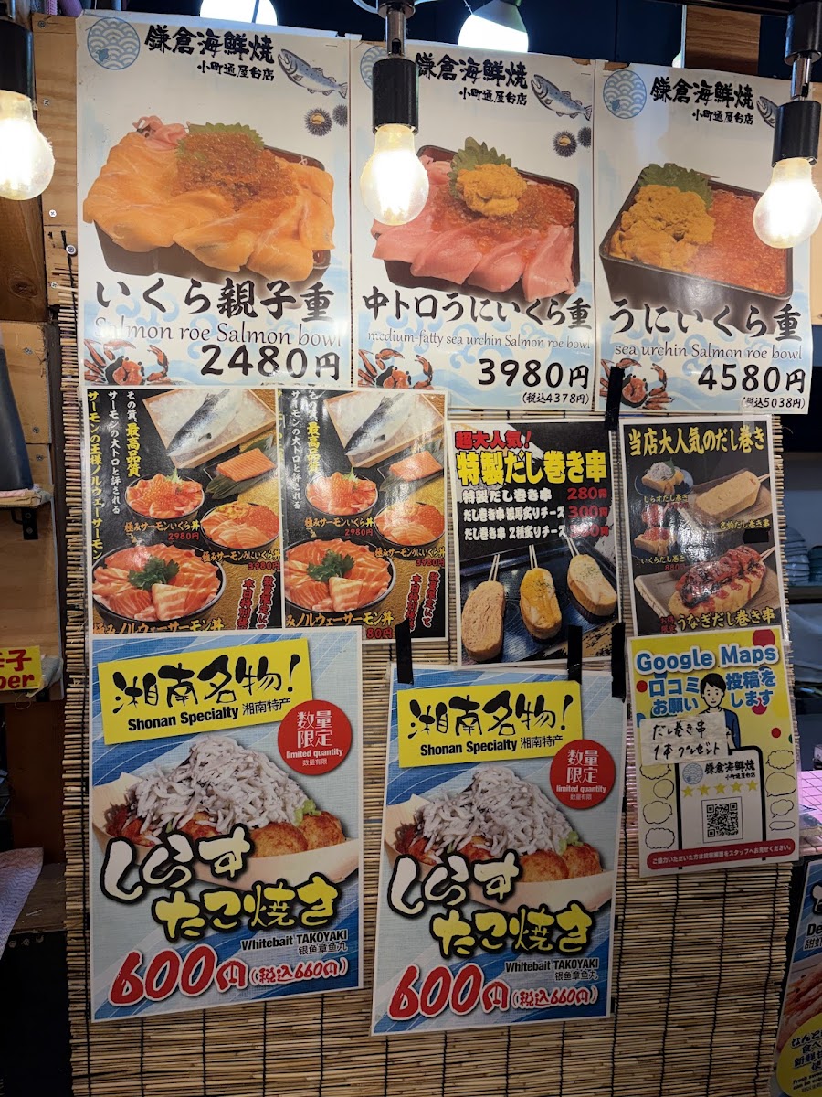 The menu at Kamakura Yatai Mura offers a delightful mix of traditional Japanese street food and fresh seafood, perfect for those seeking an authentic local experience in Kamakura. The star of the menu is undoubtedly the 海鮮 (seafood), which is complemented by various skewered options like the ツブ串ゲソ串タコ串 (abalone, squid, and octopus skewers) that showcase the flavors of the sea. For something more unique, the 生しらす丼 (fresh raw shirasu rice bowl) is a must-try, offering a taste of the local delicacy of young sardines, served over a bowl of rice.