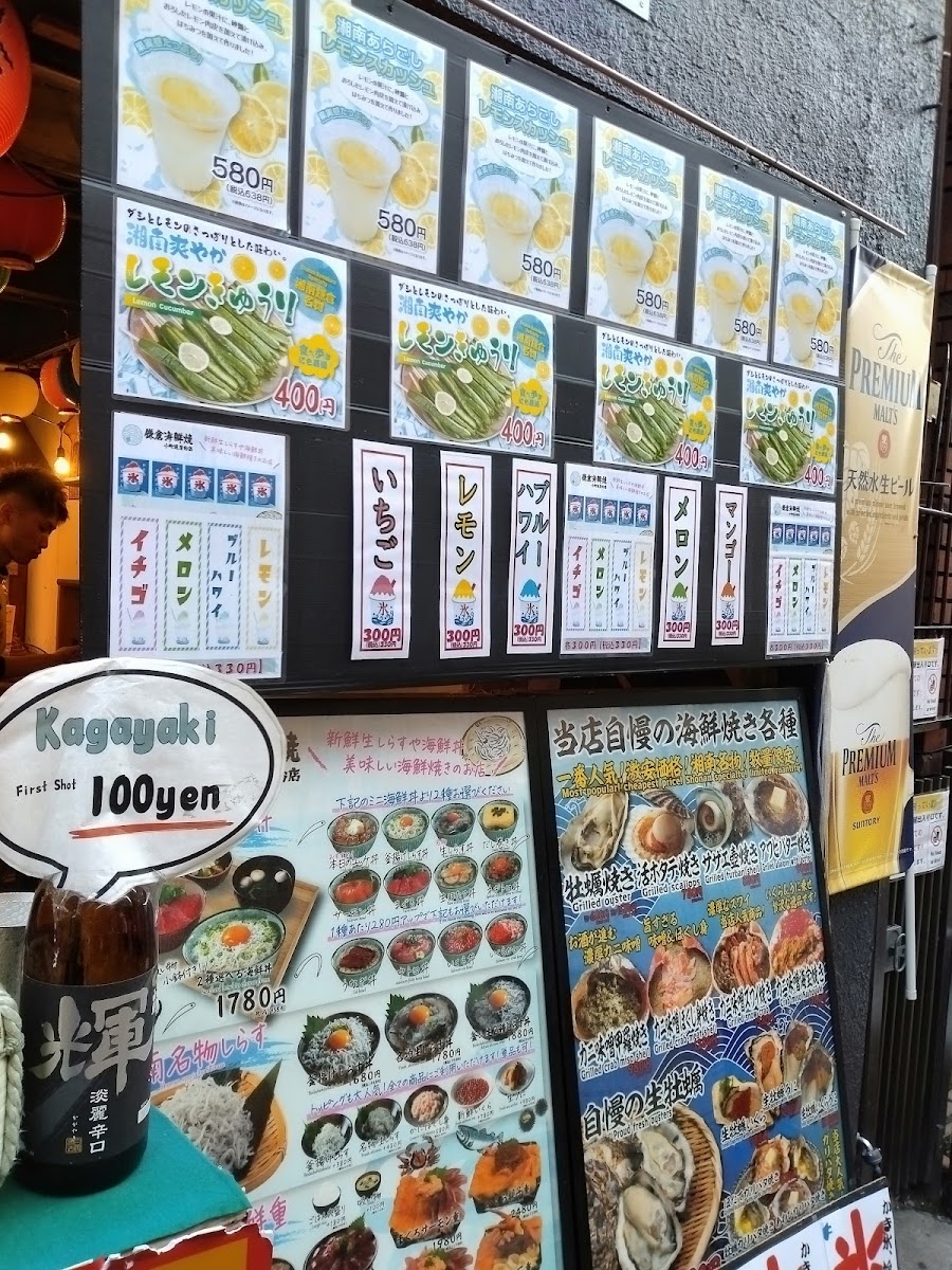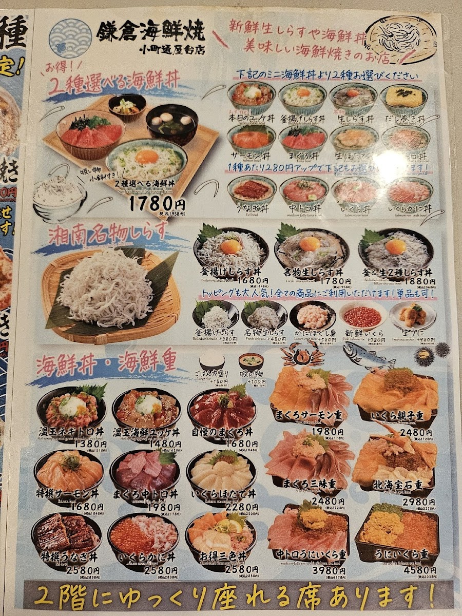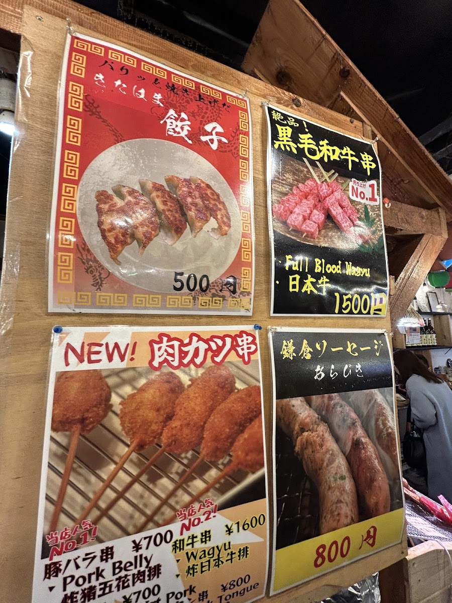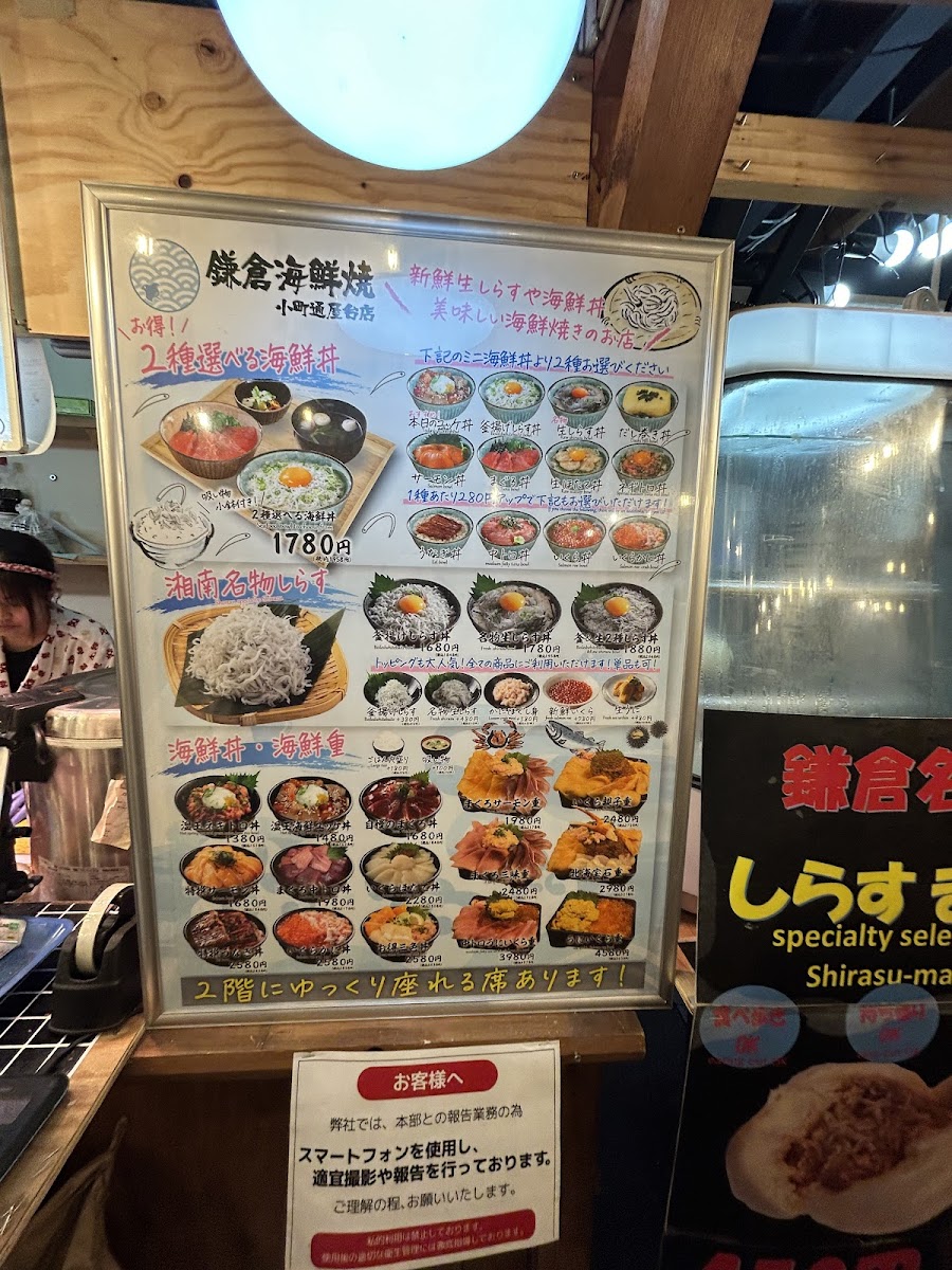 The menu at Kamakura Yatai Mura offers a delightful mix of traditional Japanese street food and fresh seafood, perfect for those seeking an authentic local experience in Kamakura. The star of the menu is undoubtedly the 海鮮 (seafood), which is complemented by various skewered options like the ツブ串ゲソ串タコ串 (abalone, squid, and octopus skewers) that showcase the flavors of the sea. For something more unique, the 生しらす丼 (fresh raw shirasu rice bowl) is a must-try, offering a taste of the local delicacy of young sardines, served over a bowl of rice.